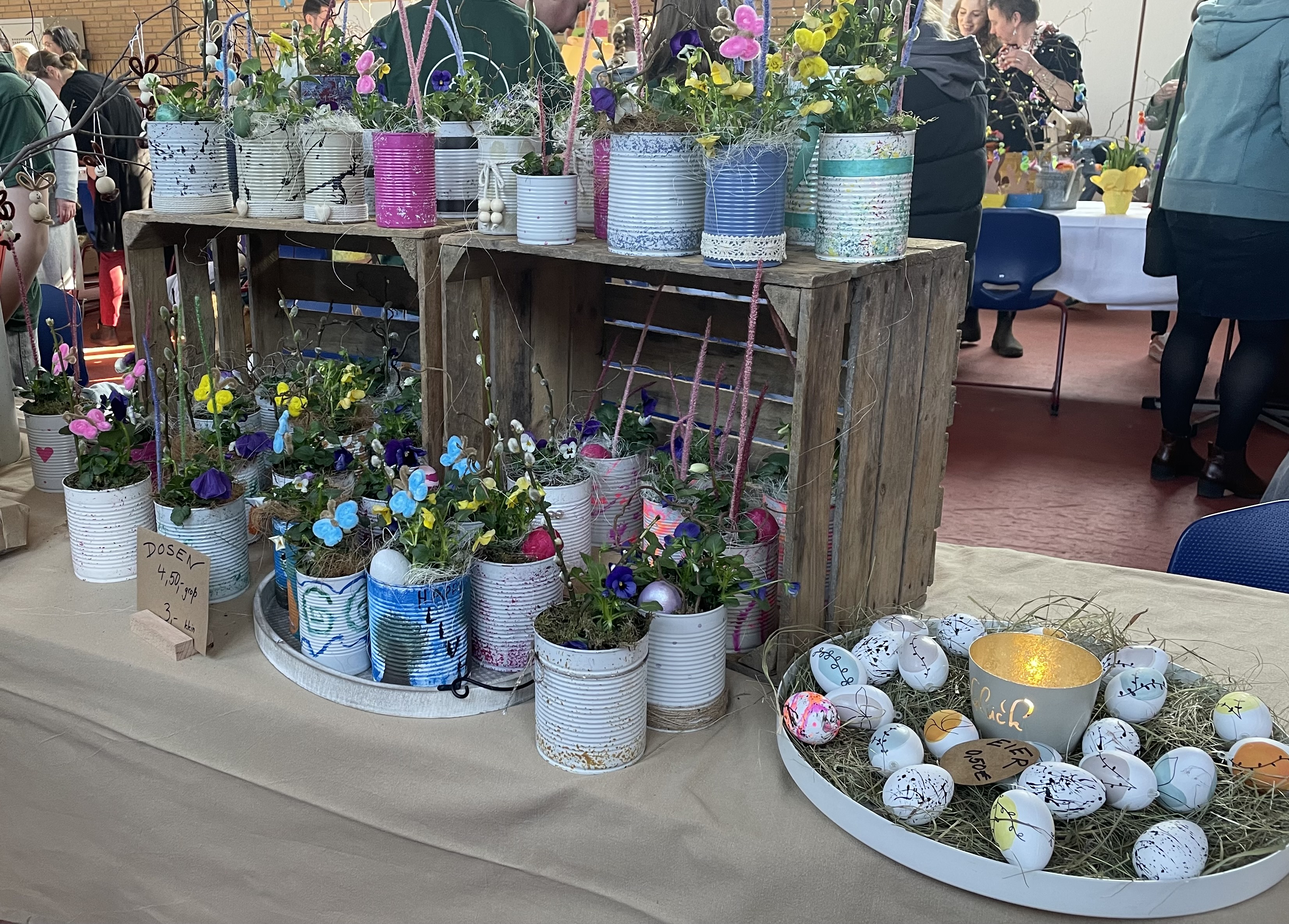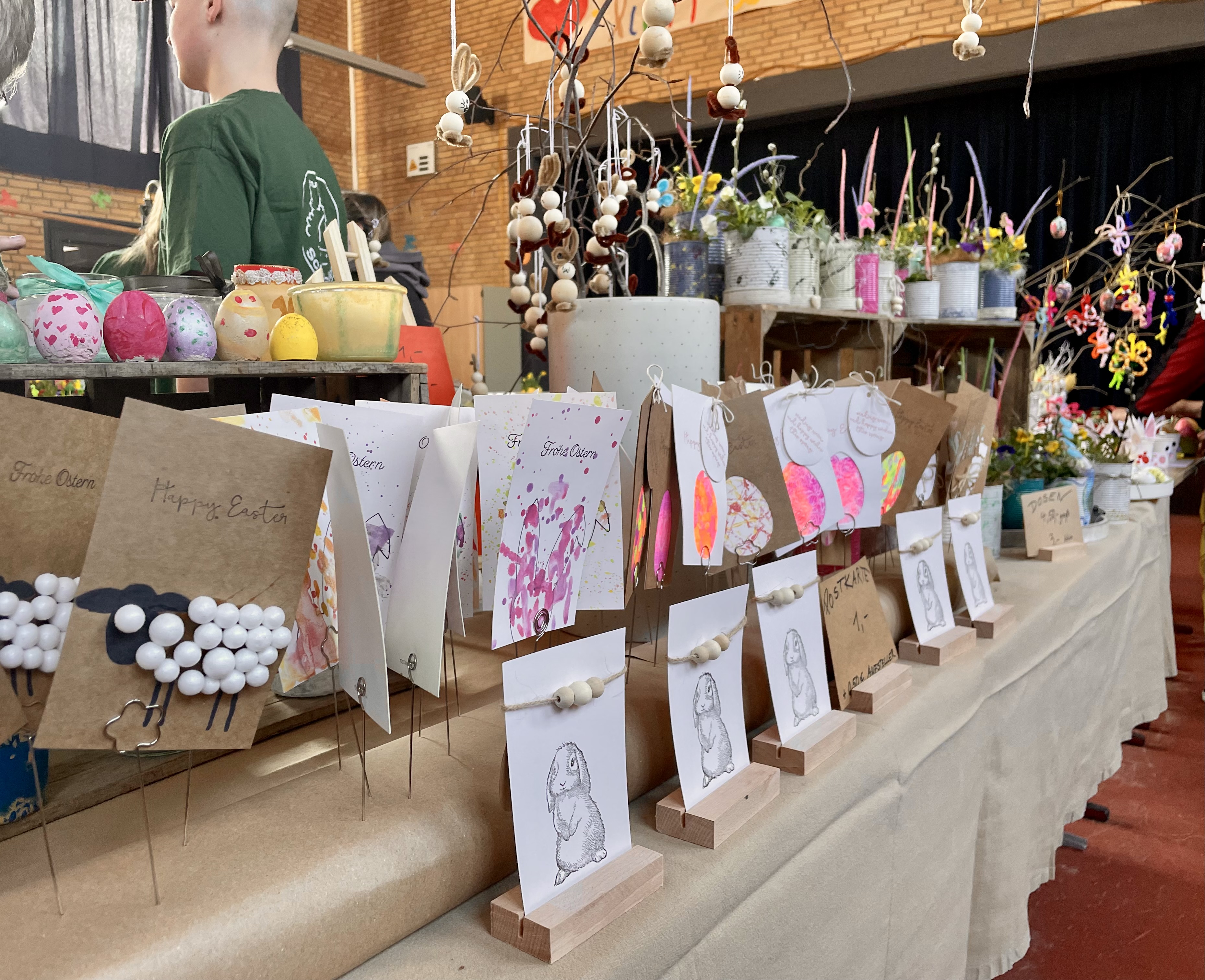 Am 21. März 2025 wurde es an der Albert-Schweitzer-Schule in Selent schon sehr österlich und wunderbar trubelig. An diesem besonderen Tag hatten alle SchülerInnen vormittags schulfrei. Gebastelt wurde bereits zwei Wochen zuvor, ein besonderer Dank gilt dem großen Einsatz der Eltern. Die Klassen und Eltern trafen sich um 14 Uhr in der Aula und richteten die Verkaufsstände für den Osterbasar hübsch her. Fleißig wurden Äste mit schwingenden Hasen aufgestellt, über die Tischdecken kullerten buntbemalte Eier und hoppelten die selbstgemachten Hasenfamilien, duftend füllten Frühlingsblumen, Ostergras und Holzanfertigungen die Atmosphäre. Alle Klassen von 1 bis 7 verkauften stolz ihre wunderhübschen und selbstgebastelten Osterdekorationen. Die Klassenstufen 8 bis 10 sorgten für Essen und Trinken, ein reichhaltiges Kuchenbuffet, eine Crêpes-Station und einen Grillstand. Die 10. Klässler gingen noch in eigener Sache durch die Reihen, boten kleine süße Hasen an und baten um eine Spende für ihren Abschlussball. Vielen Dank dafür!